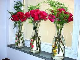 Flores vermelhas, naturais em garrafas de vidro decoradas.